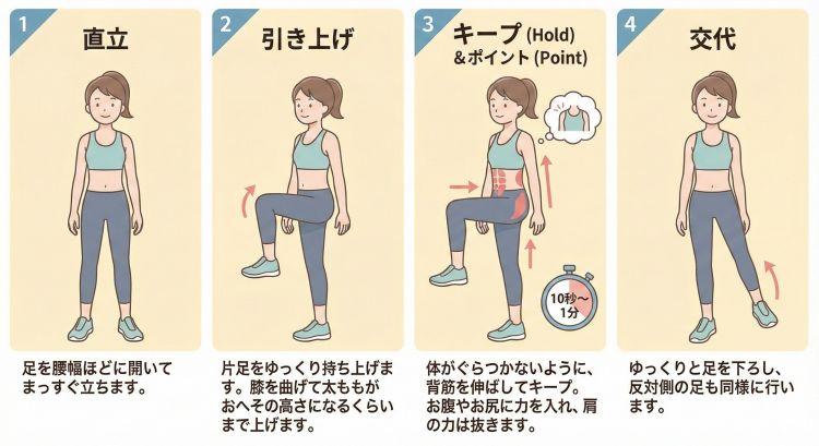 片足立ちは片足で立ってもう片方の足を浮かすのですが、浮かせた足の膝は90度直角に曲げた状態で立っています。